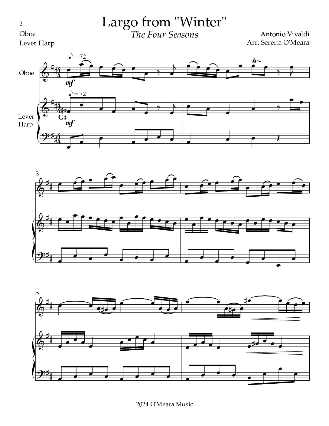 This beautiful melody of the Largo from Antonio Vivaldi’s “Winter” (L’Inverno) with Lever Harp accompaniment is a delight to play and hear. The melody utilizes a range of a 12th. Lever changes are clearly marked. Score & Parts, 7 pages.