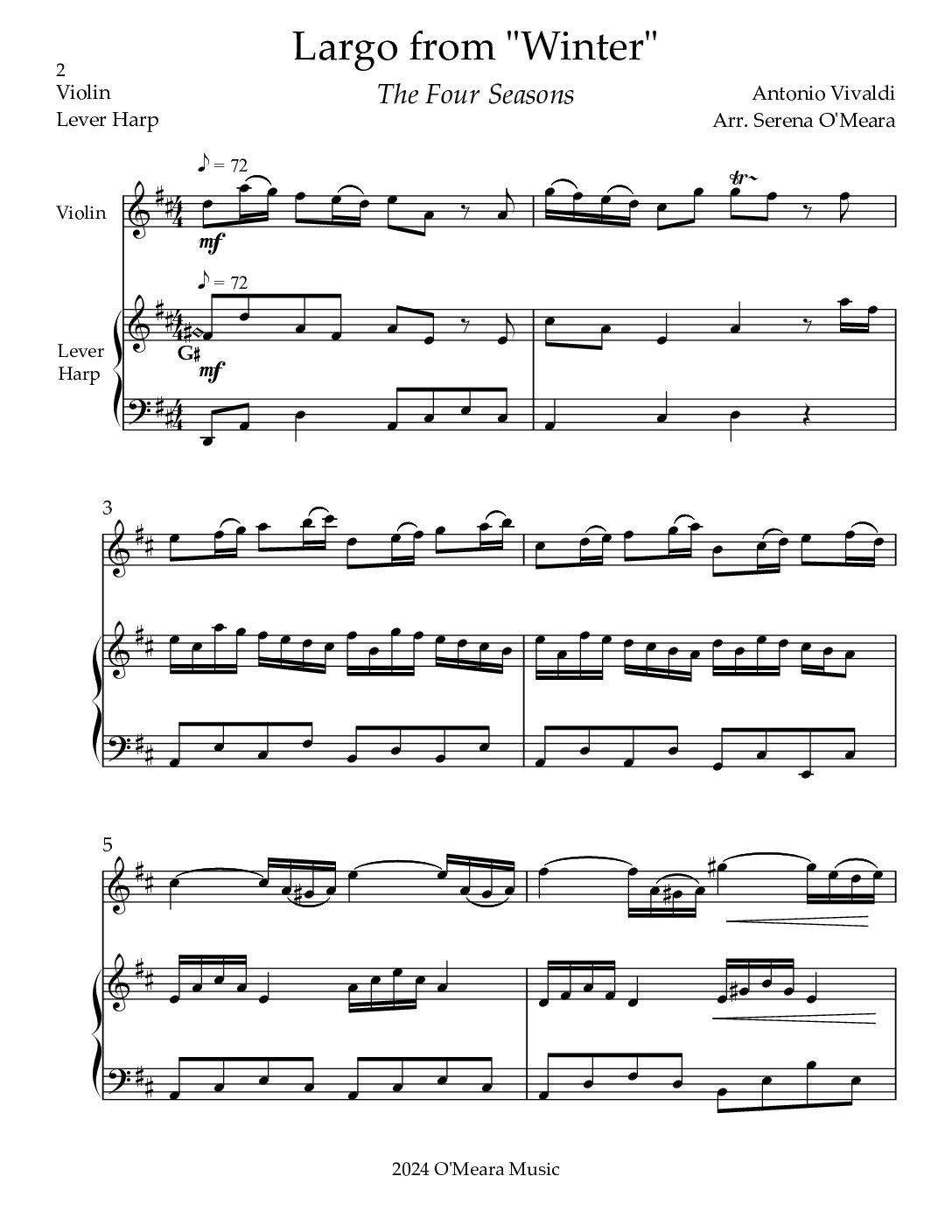This beautiful melody of the Largo from Antonio Vivaldi’s “Winter” (L’Inverno) with Lever Harp accompaniment is a delight to play and hear. The melody utilizes a range of a 12th. Lever changes are clearly marked. Score & Parts, 7 pages.
