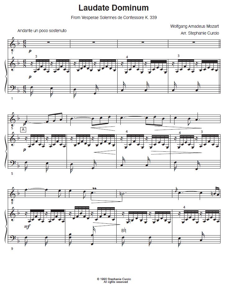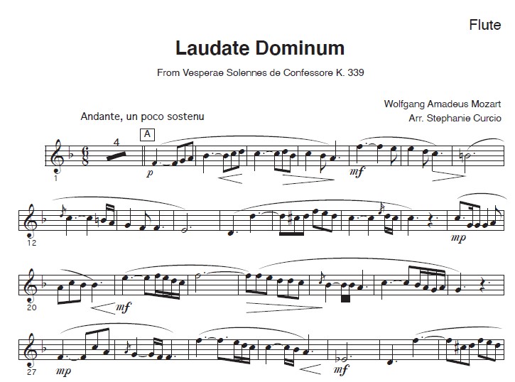 INTERMEDIATE PEDAL HARP + FLUTE/VIOLIN. A flowing movement from Mozart’s Vesperae Solennes de Confessore arranged by Stephanie Curcio for flute or violin and pedal harp. Please choose either Paper or Digital version.