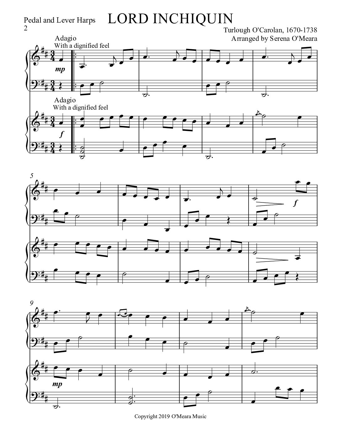 This one of Turlough O’Carolan’s most dignified slow airs. He composed it in honor of the Fourth Earl of Inchiquin, William O’Brien (1694-1777) at Drumoland Castle, County Clare. Arranged for either Lever or Pedal Harps in the key of D, the majestic melody is ornated with grace notes and turns. The melody is divided evenly between parts. Dynamics are clearly marked. Score & Parts 11 pages.
