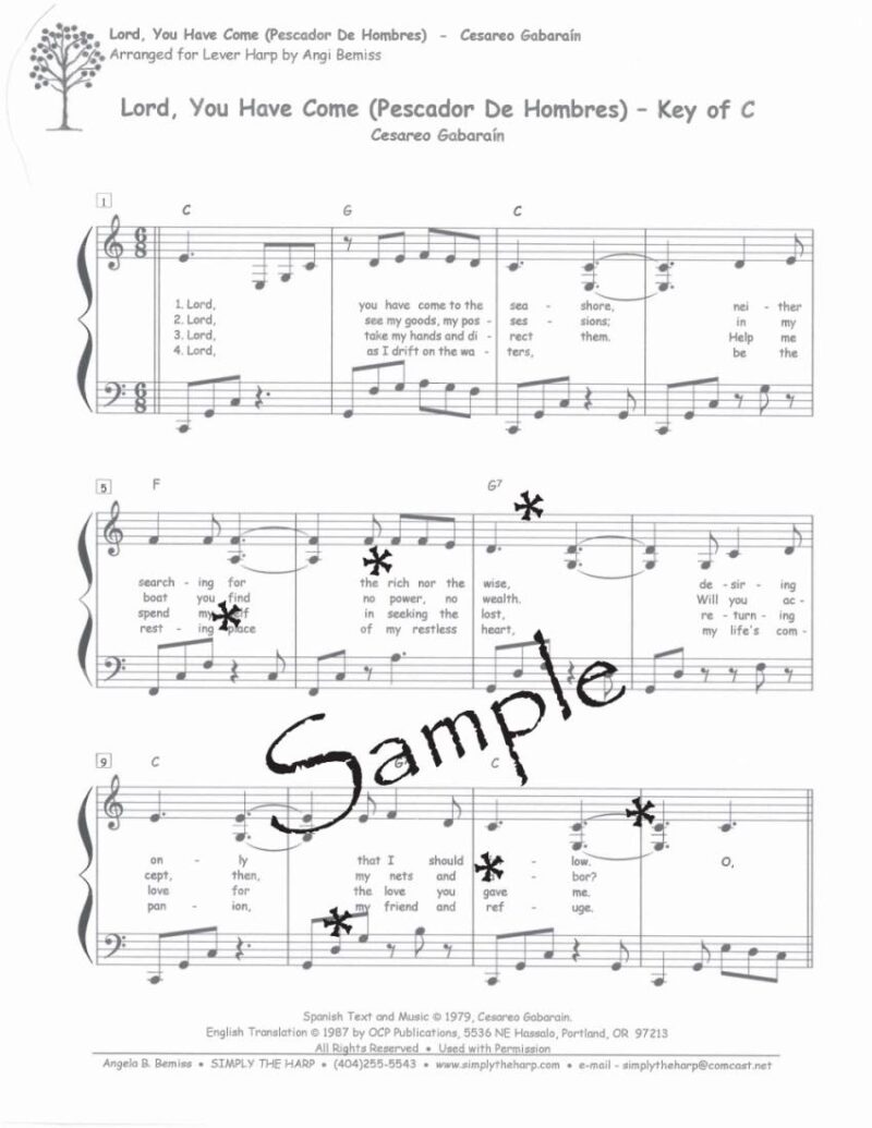 From OCP Publications, this popular Spanish Catholic hymn is presented in 2 keys: Eb and C. The C version requires full range lever harp, the Eb version can be played on a 32-string lever harp with E as the lowest note. Chords are included. Lilting 6/8 rhythm, each hand generally plays one note at a time as opposed to chords. The left hand has a few large reaches. Lyrics begin with, “Lord, you have come to the seashore, neither searching for the rich nor the wise, desiring only that I should follow…LOWER INTERMEDIATE, ALL HARPS.