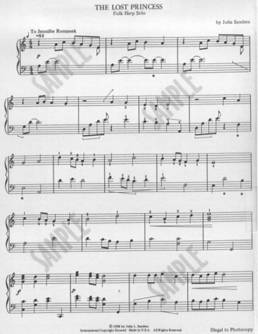This advanced beginner solo can be played on either a lever or pedal harp. There are no accidentals in this two-paged piece. Techniques include harmonics, simple arpeggios, and chords. Each hand does not play more than two or three notes at a time. EASY, ALL HARPS.