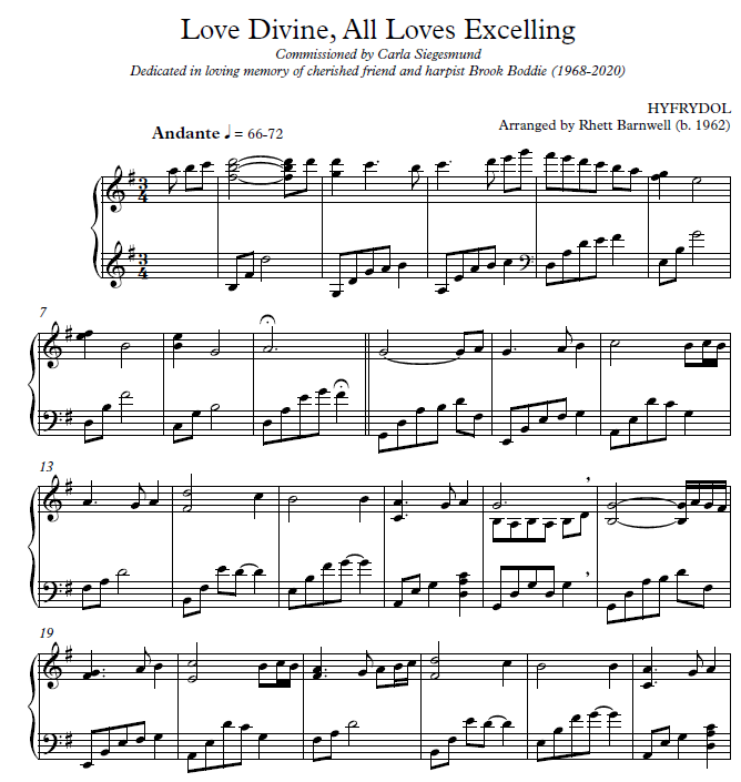 The well-loved hymn tune, “Hyfrydol”, most frequently set to the text, “Love Divine, All Loves Excelling”, has been arranged in a compelling manner by Rhett Barnwell for the advanced intermediate lever or pedal harpist. It is in the key of G, with no accidentals, and is approximately 4 minutes long. It features the first verse with alternate harmonies presented in a simple fashion, followed by a more developed 2nd verse, and a more dramatic 3rd verse, ending with a cadenza. Suitable for the Advent/Christmas season, and general use throughout the Church year.