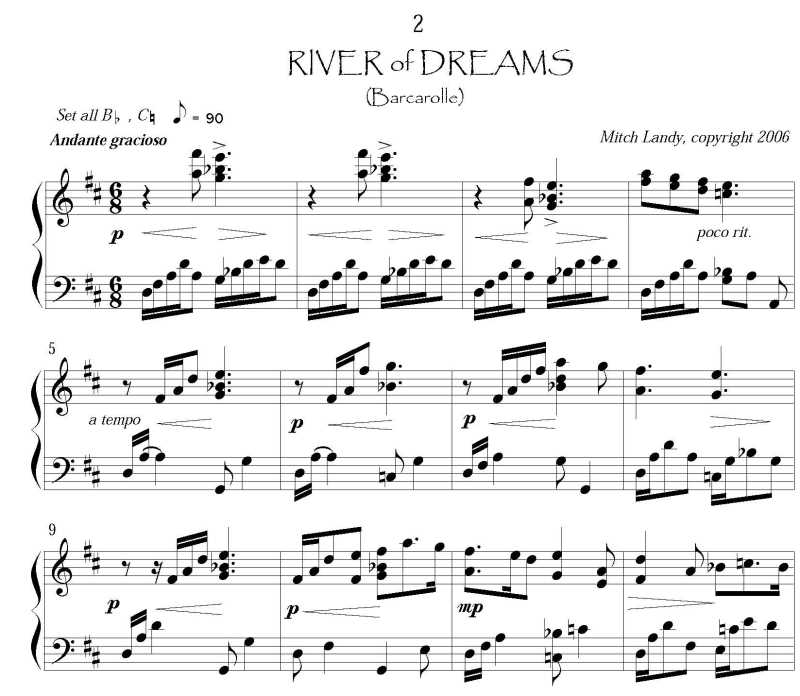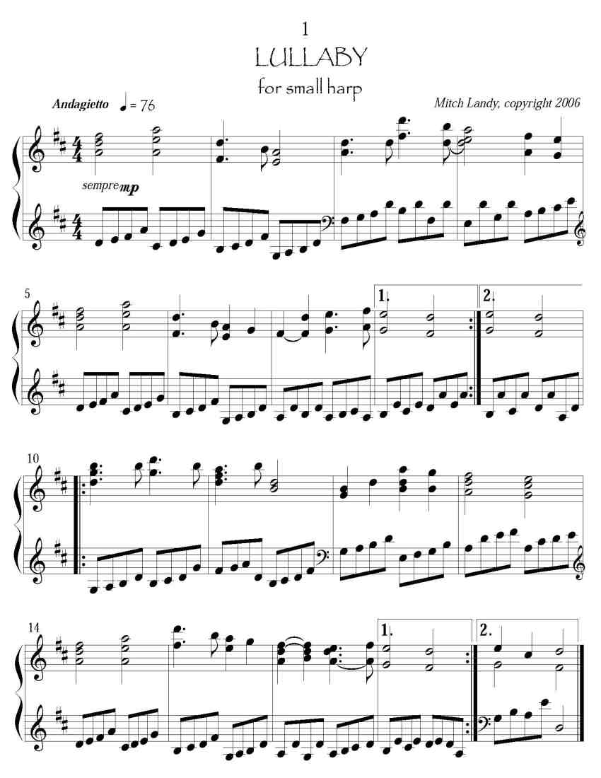 Five lullabies for lever harp, in 4 keys ranging from D to F, with no internal lever changes. Each began as an improvisation, played at a children’s hospital; then worked out as well-structured compositions. They range in style from traditional and intimate (i.e., typical lullaby) to romantically evocative (“River of dreams”) to sad (“Rainy day lullaby”) to expansive (“Western sky”).