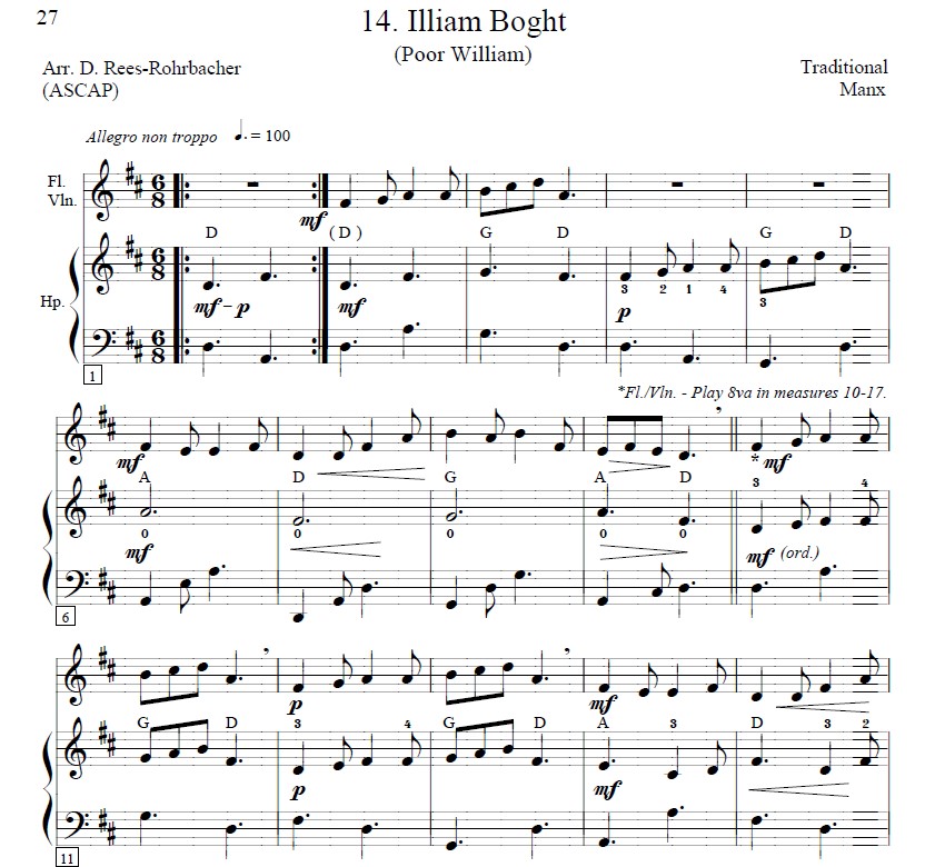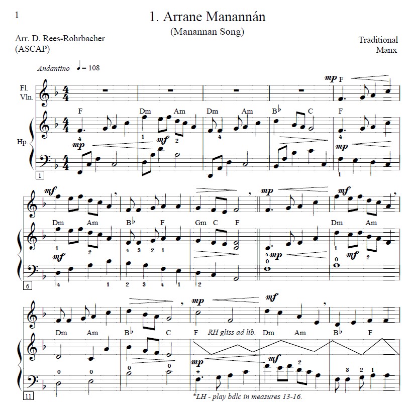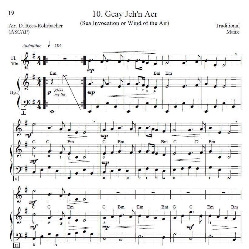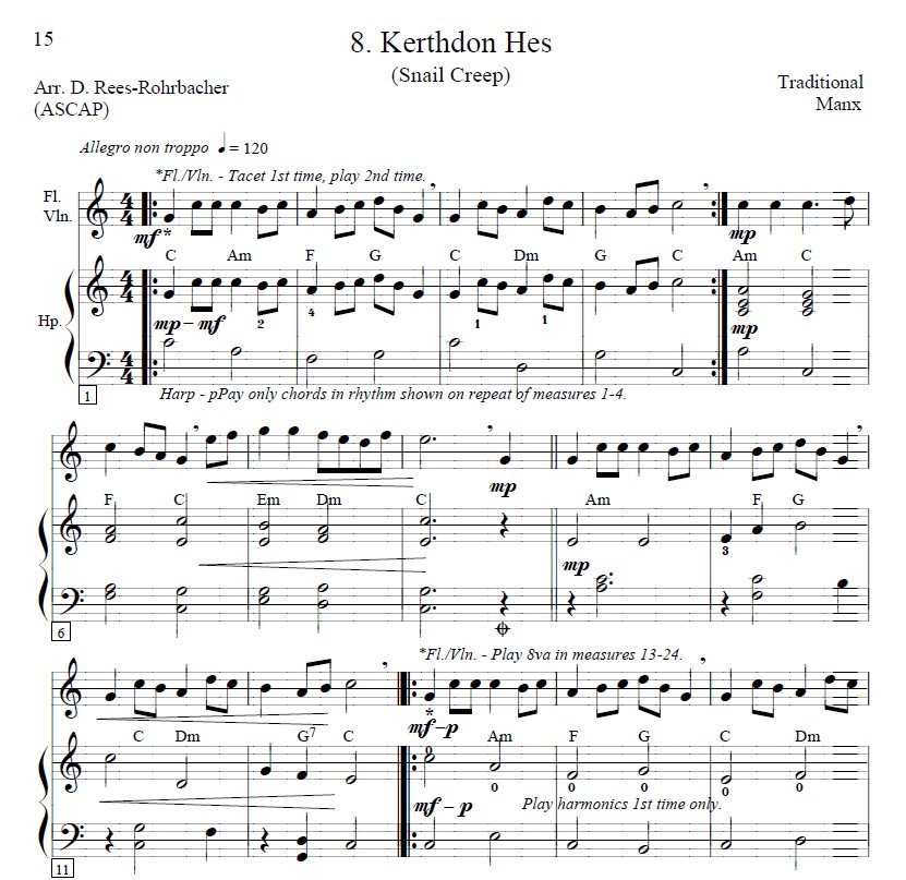 “These tunes have been placed in progressive key order to create a satisfying ‘Manx suite’ that facilitates lever and pedal changes. This order also facilitates playing a few tunes in succession as a ‘Manx medley.’ All tunes were typeset to fit exactly on two facing pages to eliminate any page turns within a piece.