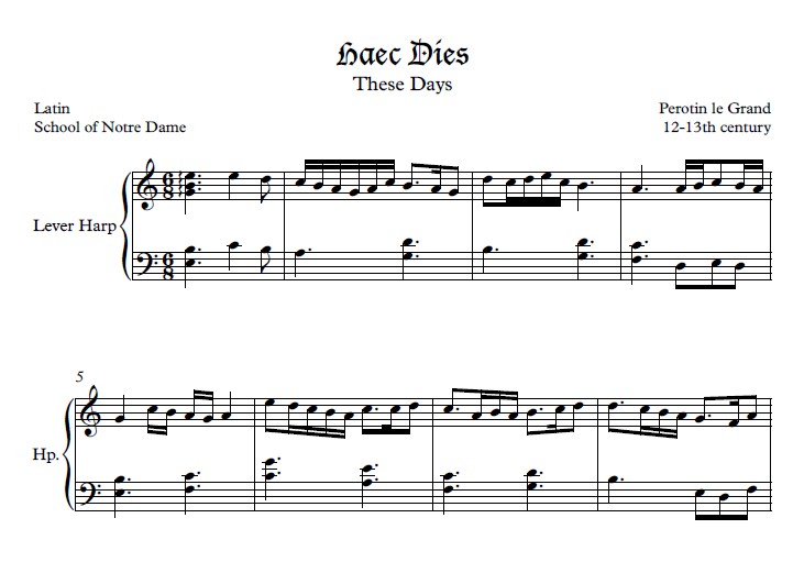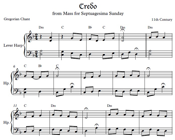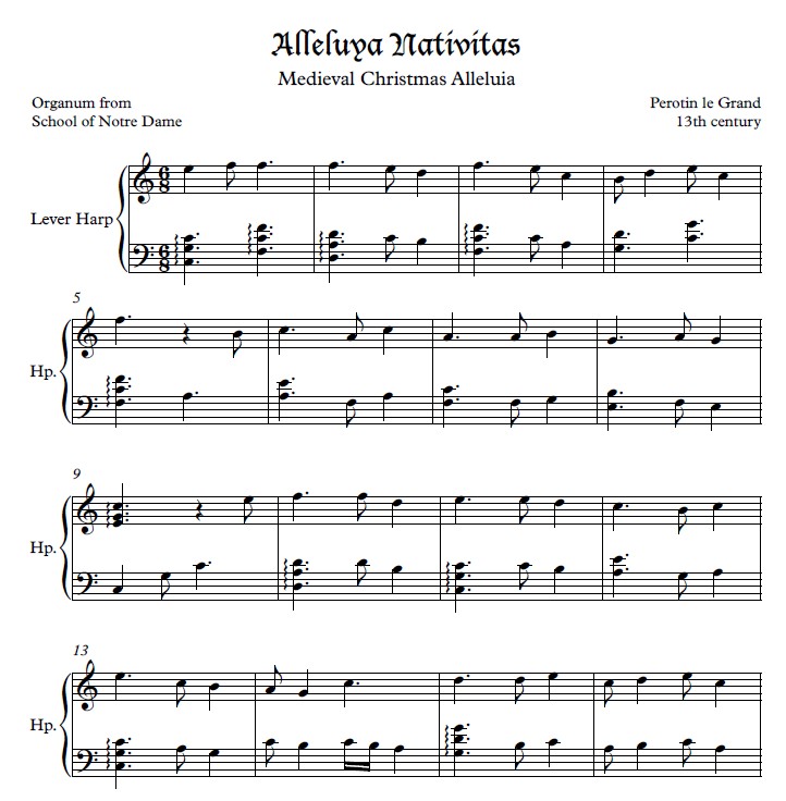 “Medieval Music for the Small Harp is a collection of 20 pieces from Medieval literature from Gregorian Chant to secular song and dance, including a setting of a Gregorian Mass for Lent. The arrangements are appropriate for a small lever harp with 1 octave below middle C and tuned to Eb or C. Songs in both tunings are noted with an * in Contents. The songs are very accessible and appropriate for mid-beginner to intermediate players with limited or easy lever changes.”