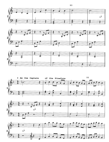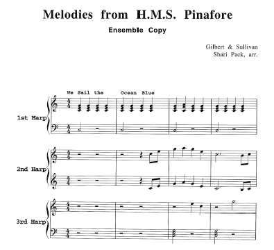 INTERMEDIATE TRIO, ALL HARPS.  Medley of four songs, We Sail the Ocean Blue, I’m Called Little Buttercup, I Am the Captain of the Pinafore, and He Is an Englishman from the operetta H.M.S. Pinafore by Gilbert and Sullivan. Arranged by Shari Pack for three lever harps, or three pedal harps.  PDF download only.