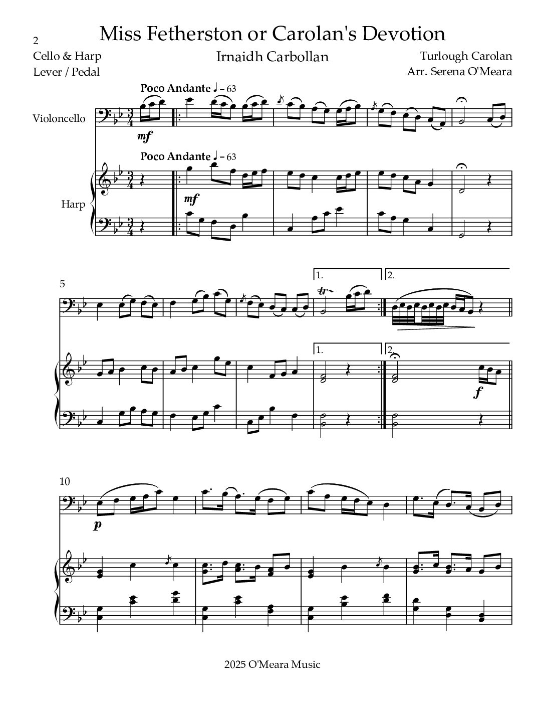 Miss Fetherston or Carolan’s Devotion, Duet for Cello & Harp