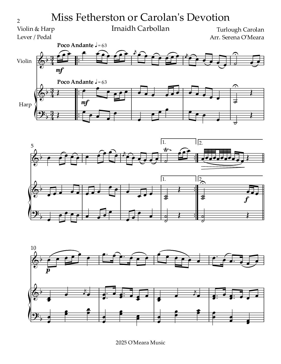 This is one of the few Italian Baroque style pieces by Carolan that has English lyrics. Playable on both Lever and Pedal Harps. Score & Parts 12 pages.