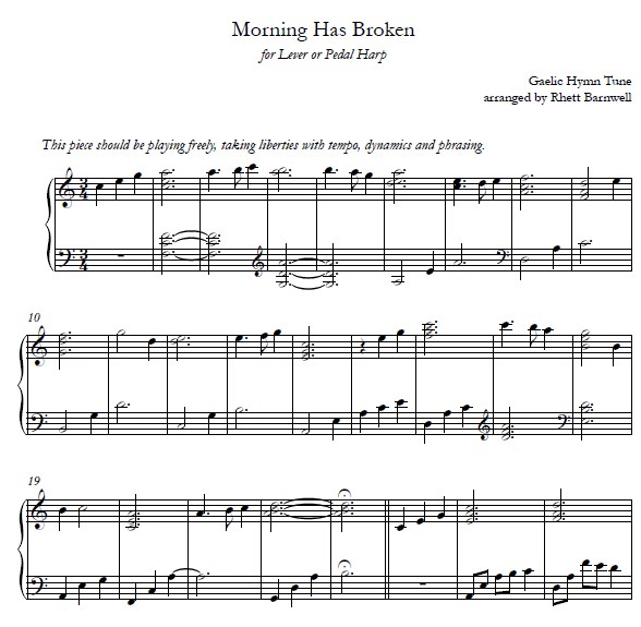 Morning Has Broken – Rhett Barnwell has taken this timeless Gaelic hymn tune and added some interesting twists to it. It begins with an introduction which could almost be a stand-alone piece by itself, followed by a verse, an interlude, a second verse, and a coda which is a variation on the introduction. In the key of C, it can be played on lever or pedal harp, with no accidentals. It is designed as an easy intermediate level piece.