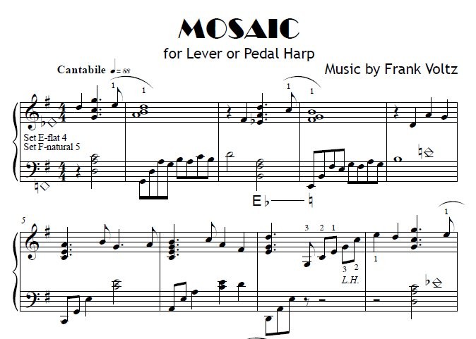 One of the beauties of the lever harp is the ability to play a C and a C# on the same harp. So by changing one lever, you can create a complex jazz chord that sounds totally foreign to the tonality customarily heard on the lever harp. Frank Voltz likes unpredictable chords on the lever harp! Well, this piece explores those beautiful chords (just by moving ONE lever) and sounds very romantic. Once again, romantic movie music.