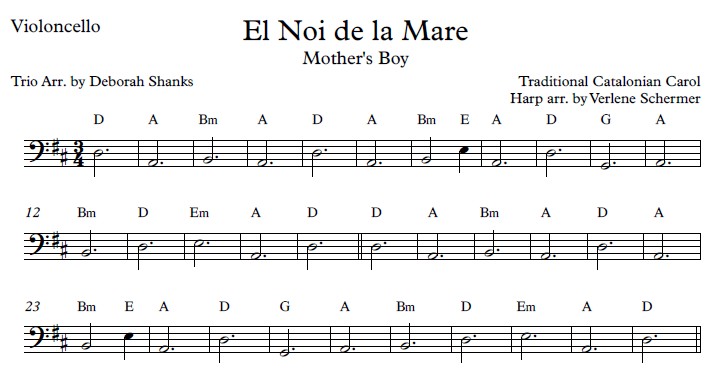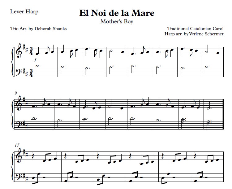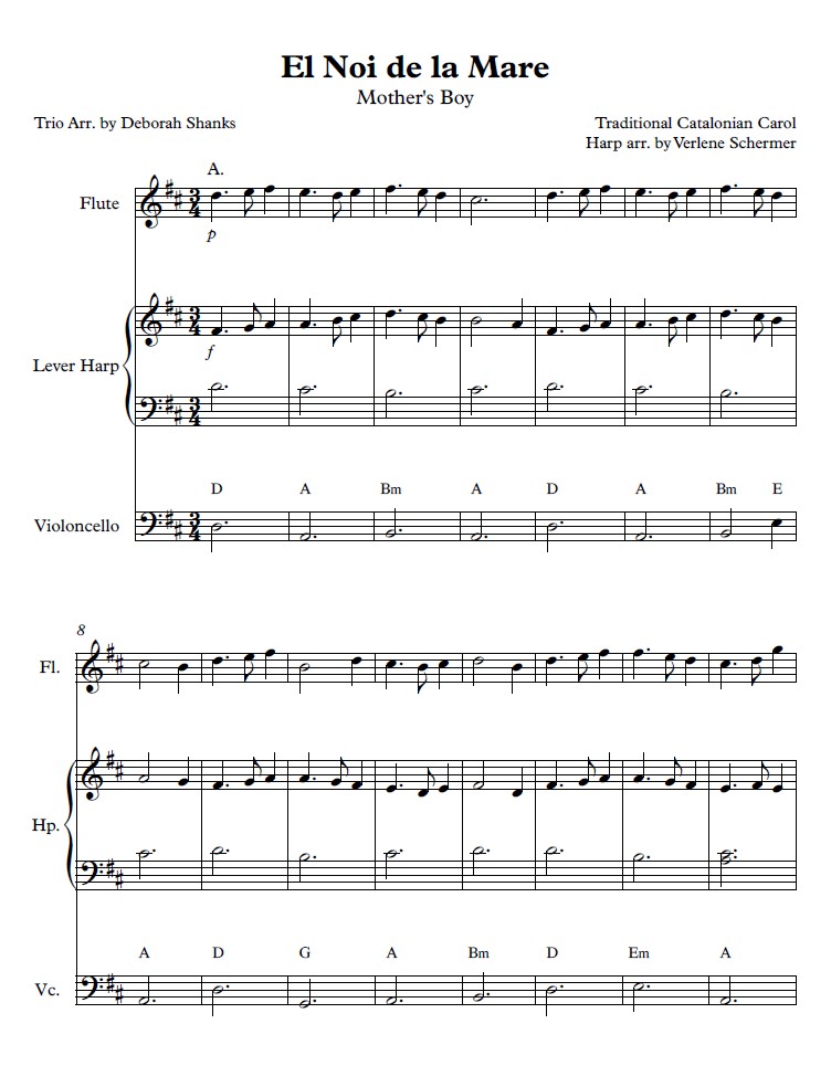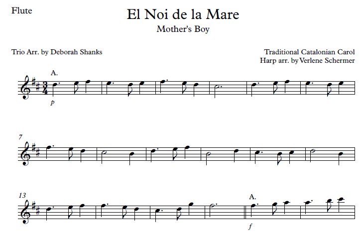 The title of this arrangement is “El Noi de la Mare” in the original Catalonian. The Christmas carol’s dotted rhythms and peninsular harmonies will enchant audiences and performers alike. The flute carries the melody with many dotted quarter rhythms. The harp part accompanies it with counter harmony, two-hand arpeggios, and LH arpeggios (up to a tenth stretch). Anchoring the arrangement, the cello has just base notes with chord symbols written for potential improvisation.