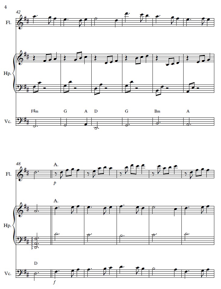 A full score (6.5 pages) and individual parts for flute (2 pages), harp (3.5 pages), and cello (1 page) are included. The harp difficulty level is intermediate. No lever changes are necessary for the harp. Key of D major (2 sharps).