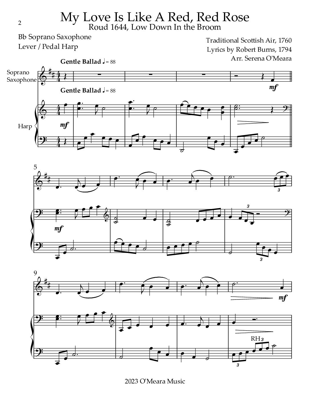 My Love Is Like A Red, Red Rose, Bb Soprano Saxophone & Harp Duet
