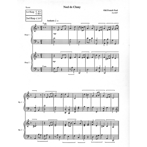 ADVANCED BEGINNER DUO, ALL HARPS. Noel de Cluny, Old French Noel, arranged by Meredith M. Mancini. For Lever or Pedal harp Ensemble, requires Bb and C#.
