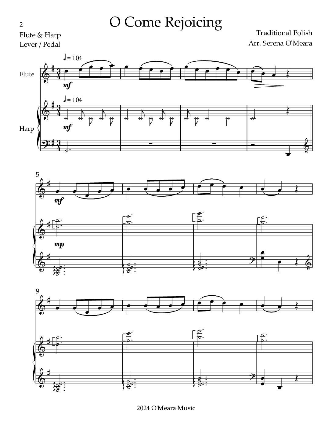 A jubilant arrangement of O Come Rejoicing for Lever or Pedal Harp. Within four verses this joyful Carol incorporates numerous sound effects on the harp: knocking, harmonics, glissandos plus canon form and high, twinkling notes. Score & Parts, 14 pages.