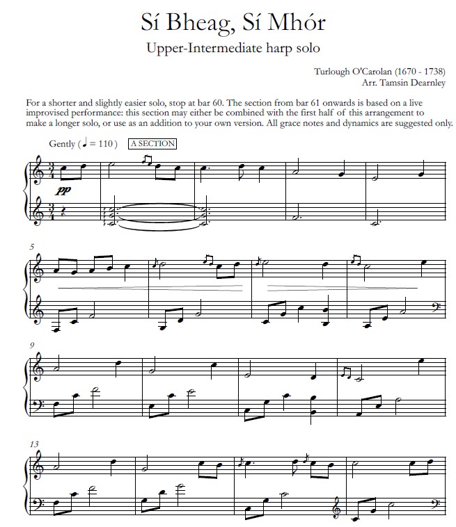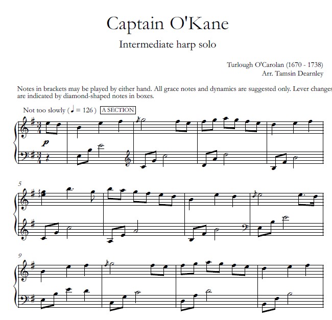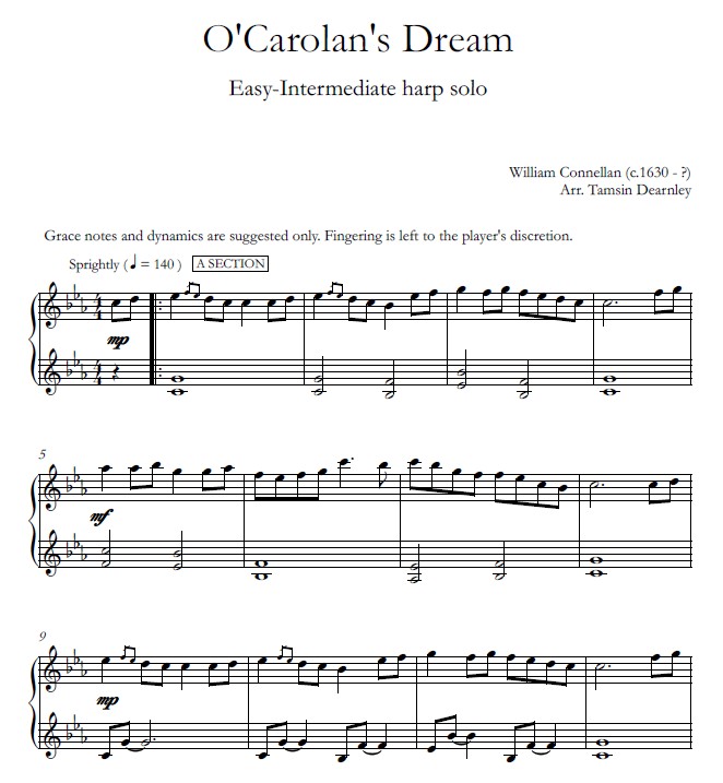 ALL HARPS SOLO, INTERMEDIATE.  A collection of 9 Irish compositions, most of which are attributed to Turlough O’Carolan, arranged by Tamsin Dearnley for lever or pedal harp solo.  Scroll down for a video recording of one of the selections.