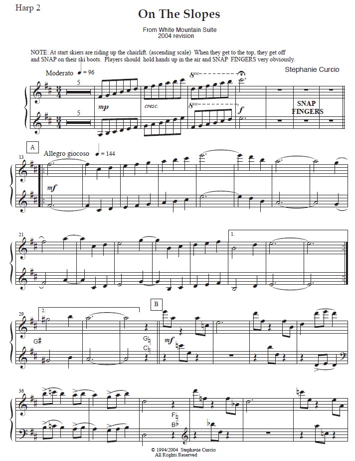 Key of D major. A continuously moving triplet counter melody (Harp 3), a temporary shift into the key of F major, and finger snaps feature in this piece. Harp 3 is somewhat more difficult than the other two parts. Included are the score (7 pages) and three separate parts (2-2.5 pages each). INTERMEDIATE, PEDAL HARP TRIO.