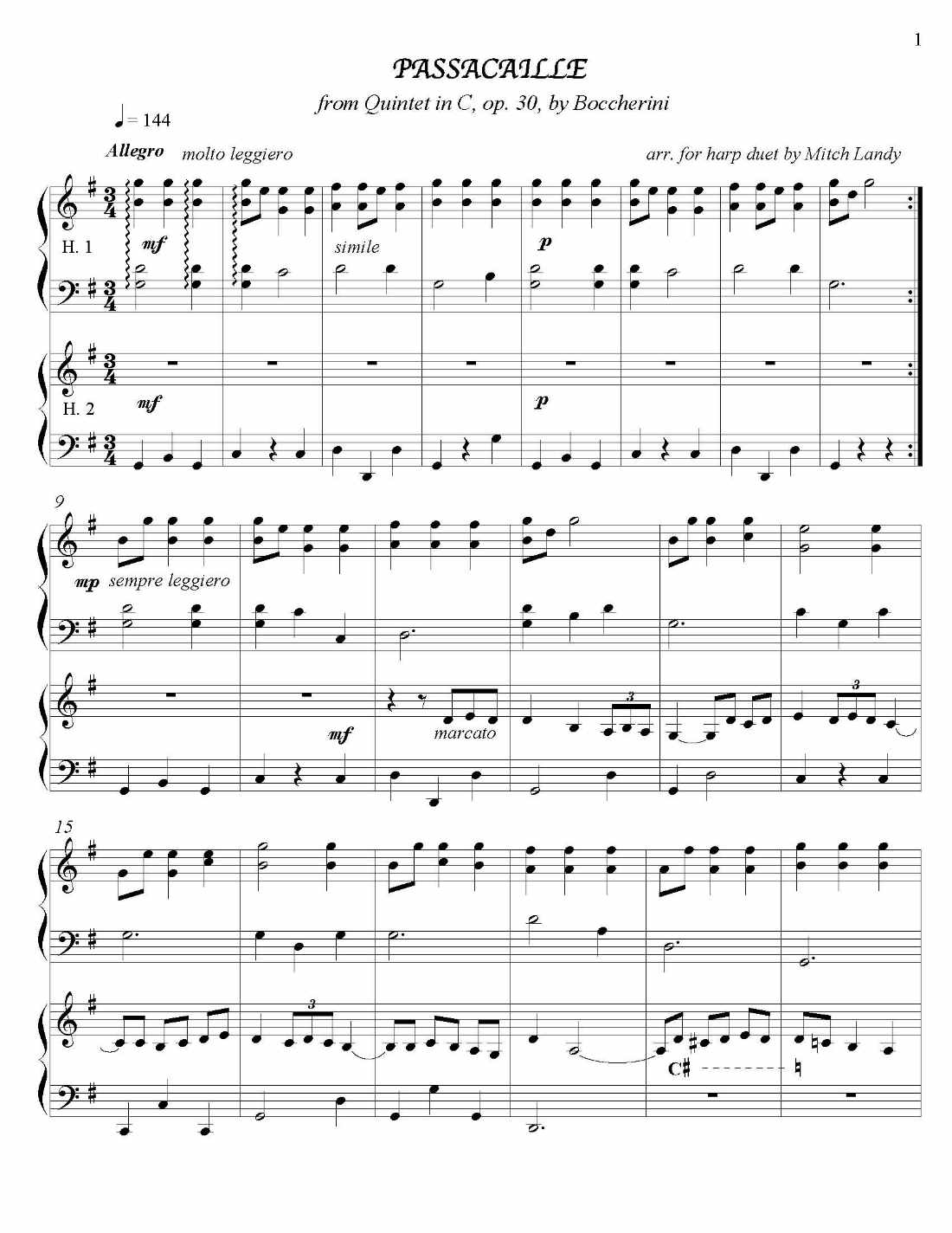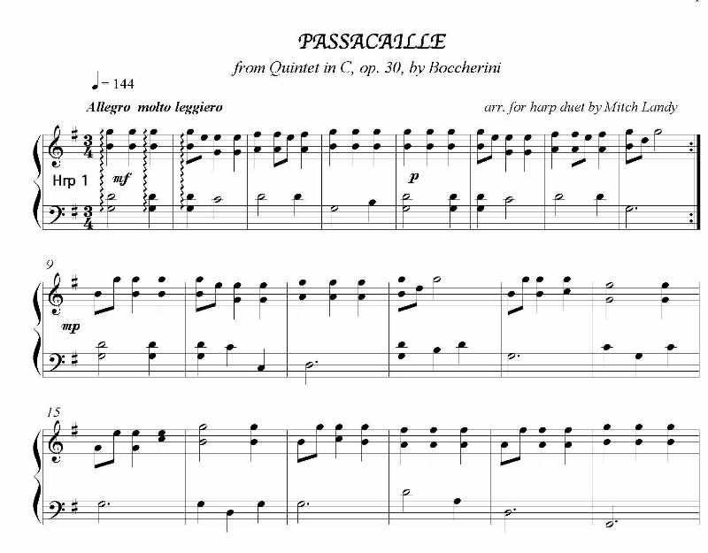 Familiar to many from the end of the movie “Master & Commander,” this short piece from Boccherini’s String Quintet in C, op. 30 #6, intended to portray the sounds of a night watch patrol in Madrid, is here arranged for two lever harps. Harp 2 has the only lever changes. Some liberties have been taken with both form and detail (transcribing from bowed to plucked instruments). Score and individual parts are all included in this single publication. Harp 1 and Harp 2 are each three pages in length.