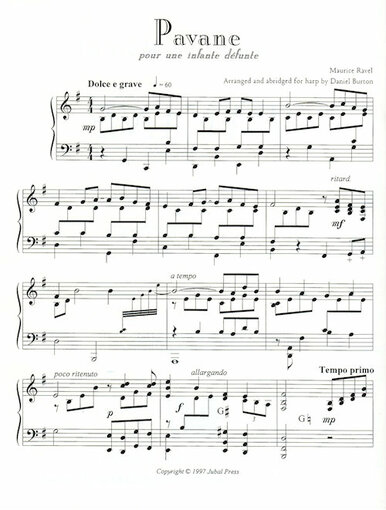 A harpistic, musically satisfying arrangement of the marvelous Pavane. 3 pages, key of G, meter change, few accidentals, more advanced. UPPER INTERMEDIATE PEDAL HARP