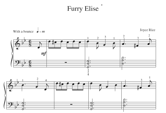 Loonlight (Claire de Lune), The Crone’s Croon (Lullaby from Humperdinck’s Hansel and Gretel), Eine Kleine Ninth Musik (from Beethoven’s 9th), Goodness Grace (based on Amazing Grace), Chopped Sticks (self explanatory), What Sleeves is This (Greensleeves), A New-Fangled Manner (The Star Spangled Banner), Furry Elise (Beethoven’s Für Elise), Row Row Row your Barge (Air from Handel’s Water Music), The Spider’s Ballet (Merry Widow).