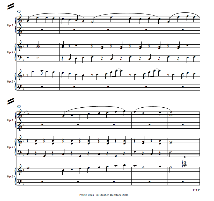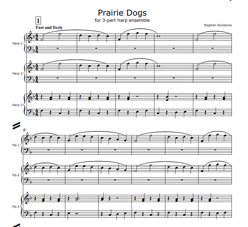 However, you should feel free to switch things around, depending on the numbers of harpists playing and their experience: for example, less experienced players might prefer to stay on the tune, while others play the trickier passages. To this end Stephen Dunstone has produced parts for harps 1, 2 & 3 to match the score, and also a separate part that shows all the different motifs, to suit players who are going to swap motifs around. You’ll also notice that there are no dynamic markings. This is because the dynamics will need to vary according to how many players are on each part. Essentially the piece is lively and strong, with a lighter 3rd verse.