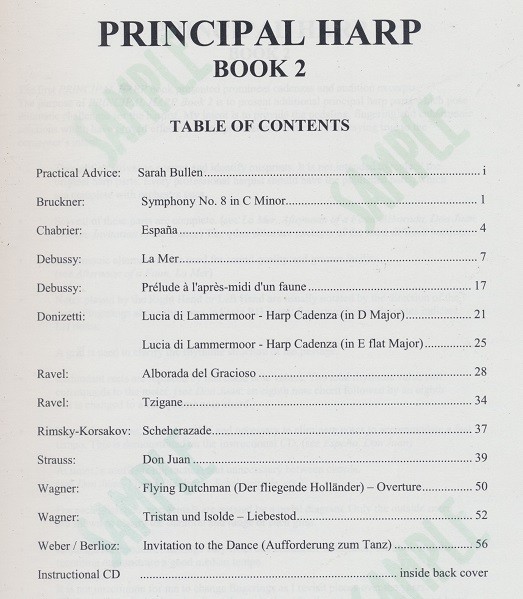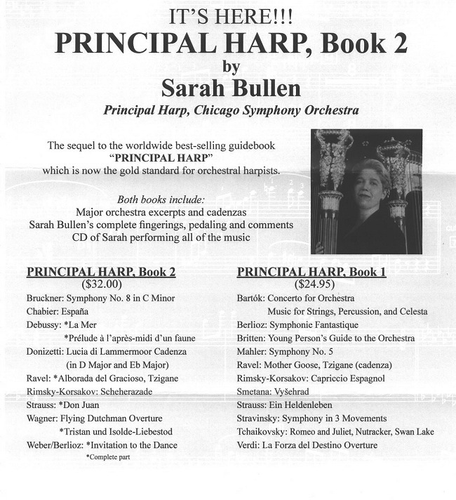 The sequel to the guidebook “Principal Harp”. It includes major orchestra excerpts and cadenzas with Ms. Bullen’s complete fingerings, pedaling and comments. Plus a CD performed by Ms. Bullen, performing all of the music. Volume 2 includes: Bruckner Syhphony No. 8, Chabrier Espana, Complete parts to Debussy La Mer and Prelude to the Afternoon of a Faun, Donizetti Lucia de Lammermoor Cadenza (in both D and Eb.), Complete parts to Alborada del Gracioso, Tzigane (Ravel), Don Juan (Strauss), Wagner Tristan und Isolde-Liebestod, and the Weber/Berlioz Invitation to the Dance. Plus Rimksy-Korsakov Sceherazade, Wagner Flying Dutchman Overture. Click on the image below to see the flyer with complete explanation.