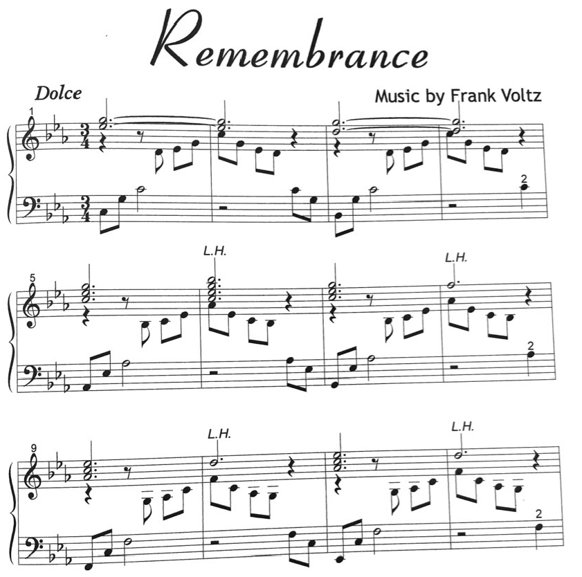 When Frank Voltz’s mother passed away in 2018, he was reminded of piano lessons and braces she provided for him as a child. This piece is a grateful remembrance to her memory for all the love she gave him. Music is light, sweet, and delicate with a heavenly sonority. It begins with a lovely and haunting melody. The middle section consists of a flowing arpeggiated pattern supporting the melody. Left hand patterns are simple and hand-over-hand arpeggios are clearly notated. In the key of Eb Major, easy page turns and one lever or pedal change.