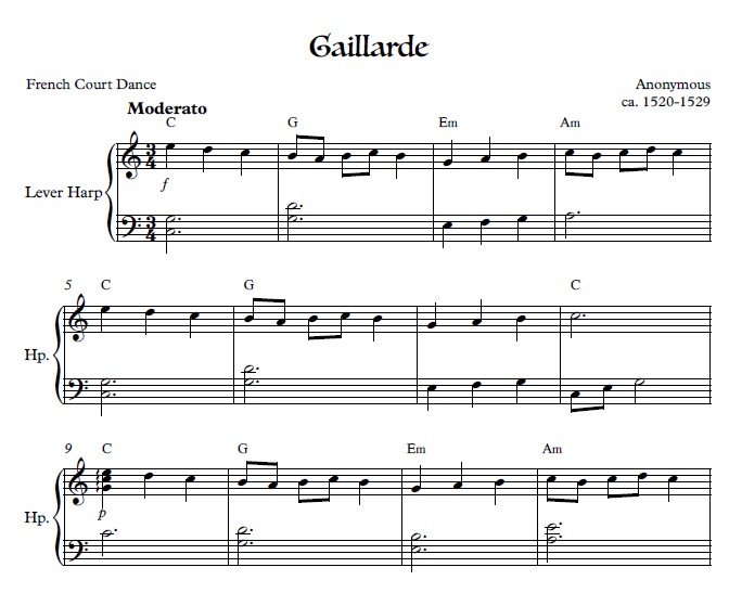 “Renaissance Dances for the Small Harp includes 21 dances from lute, vilhuela and other instrumental consorts of the period. The dances are typically associated with the country from which they originated. Most dances are court dances, but some were strictly for listening entertainment. The arrangements are appropriate for a small harp without levers and with 20-22 strings (starting with G below middle C) or 26 strings (starting one octave below middle C) and tuned in C. All arrangements are very accessible for a mid-beginner to intermediate level player without levers.”