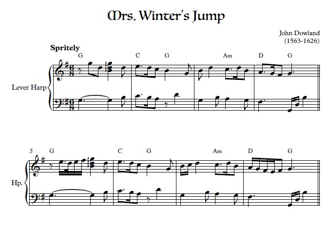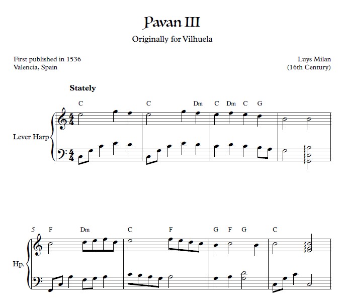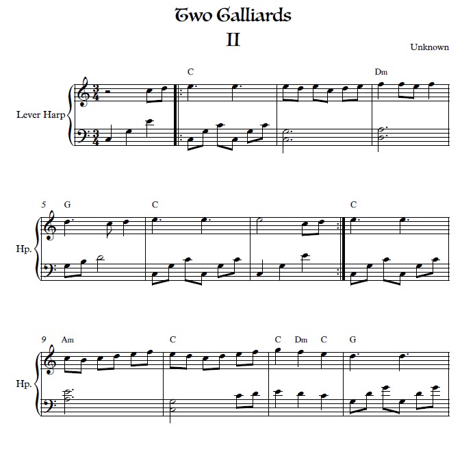 “Renaissance Dances for the Harp includes 21 dances from lute, vilhuela, and other instrumental consorts of the period. The dances are typically associated with the country from which they originated and were often paired into a slow dance followed by a faster dance. Most dances are court dances, but some were strictly for listening entertainment. The arrangements are appropriate for a large lever harp with 2 octaves below middle C and tuned to Eb or C. Songs in two tunings are noted with an * in Contents. The songs are very accessible and appropriate for mid-beginner to intermediate players with limited or easy lever changes.”
