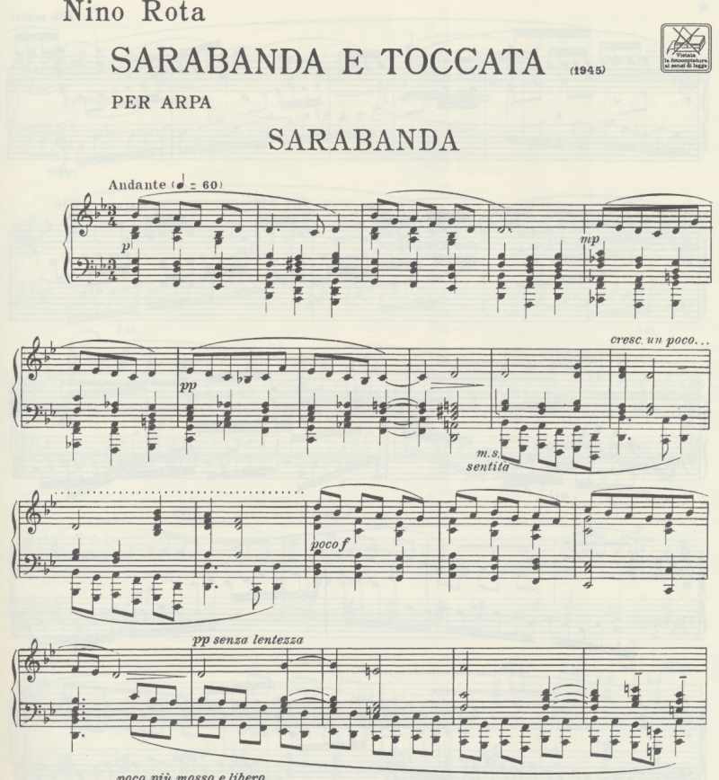 Advanced pedal harp music requiring good placing technique to execute difficult technical passages. Sarabanda is 4 pages, G minor, with a very active LH. Ends with a calmo G major passage. Toccata in ¾ key of C, 4 pages. Therese Honey played this at a recital years ago and I remember thinking what a great piece! ADVANCED PEDAL HARP.