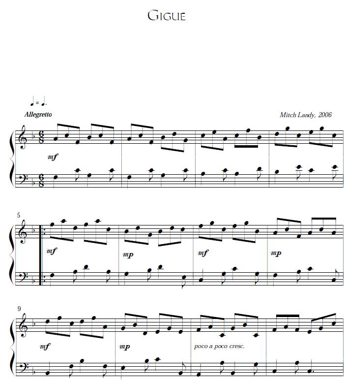 Two pieces in baroque style for lever or pedal harp. Sarabande is in ¾, key of F and an easy piece. Two pages in length. Ornamentation consists of a couple of trills and a mordent. The gigue is in the key of F and 6/8. Left hand keeps busy, and there is a C# accidental. Nicely notated and easy to read. Has a lilting drive to it. LOWER INTERMEDIATE, ALL HARPS.