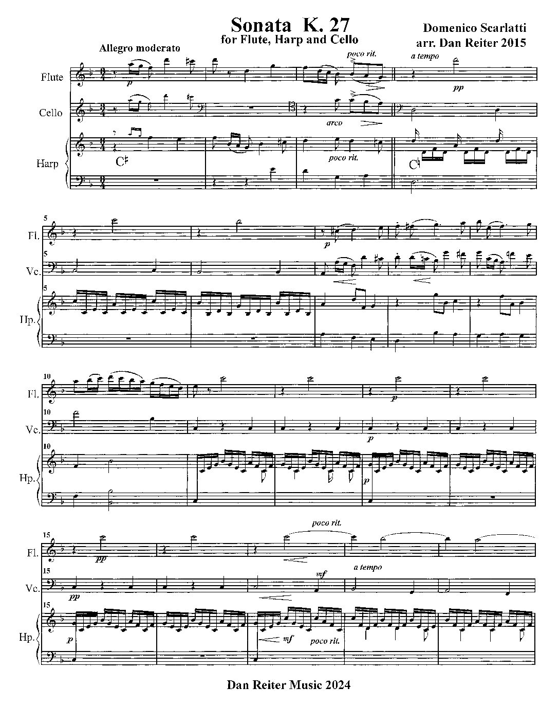 Greetings fellow musicians and fans of Domenico Scarlatti. This piece is one of seven Scarlatti sonatas for harpsichord arranged by Dan Reiter for a trio of flute, harp, and cello