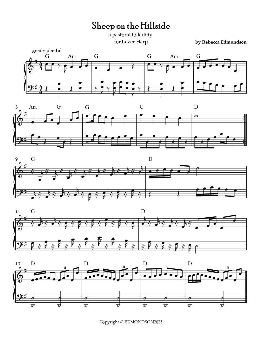 This pastoral folk ditty, Sheep on the Hillside, paints a mental image of a serene country hillside where sheep are complacently grazing. Then the sheepdog appears causing the sheep to be uncertain as to where to turn! Enjoy this delightful tune with its rhythmical surprises. Intermediate Lever – 2 pages