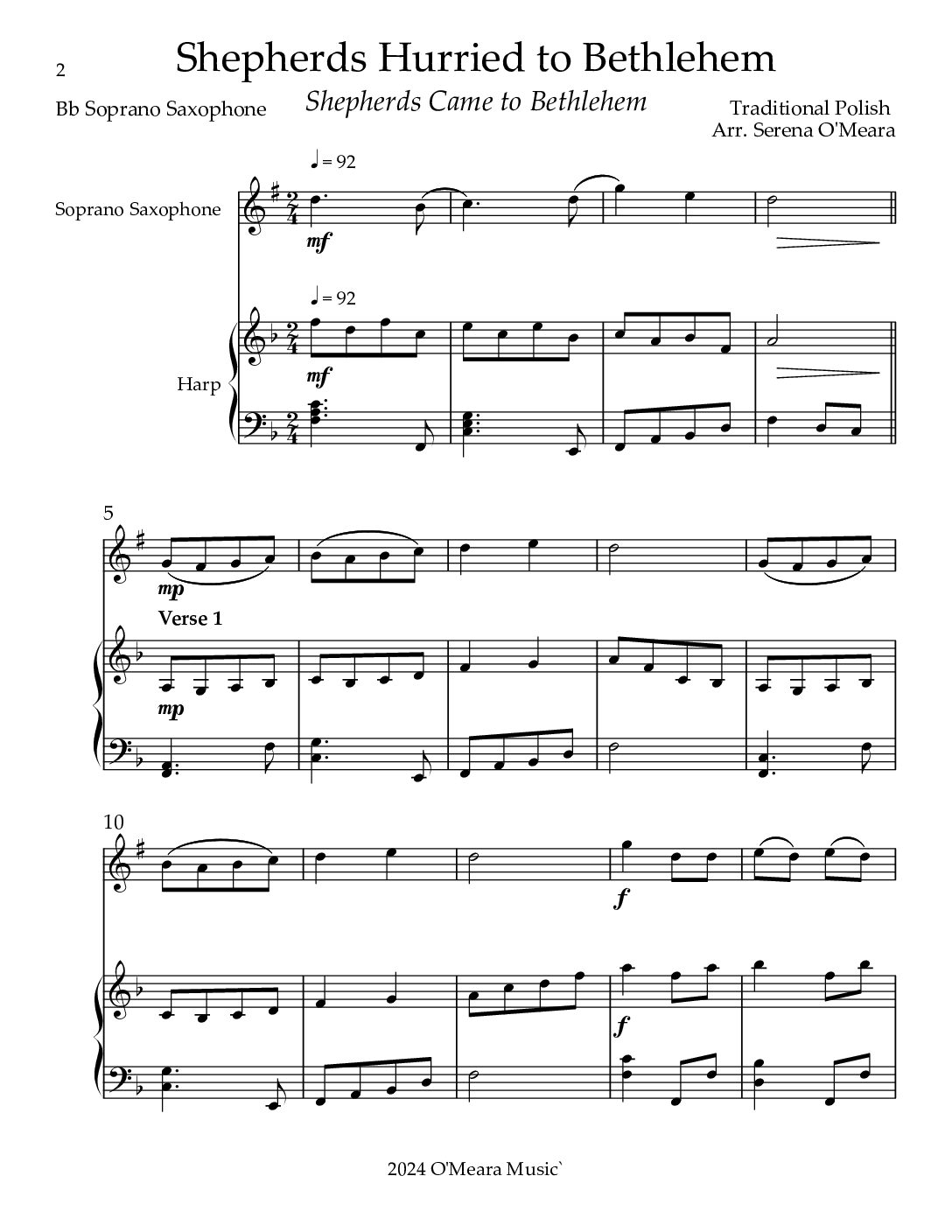 Shepherds Hurried to Bethlehem, Duet for Bb Soprano Saxophone & Harp