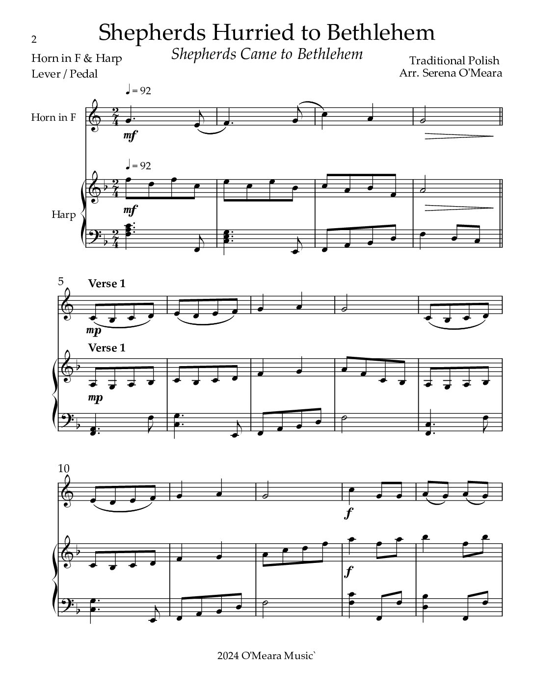 Shepherds Hurried to Bethlehem, Duet for Horn in F & Harp