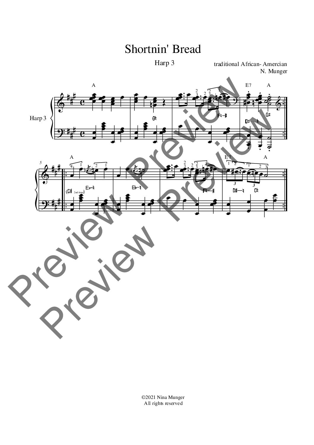 Part 3 is a melody of the tune. Part 4 was created solely as a backup so harpists could fill out the four-harp ensemble with a traditional “Fiddle” / Bluegrass style accompaniment. Each part has chord names written above the measure for improvisation and/or fretted (guitar) instruments accompaniment ease.