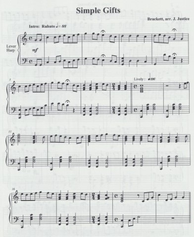 This wonderful Shaker hymn by Joseph Brackett, Jr. has been used in many arrangements such as Aaron Copland’s Appalachian Spring. It is also often associated with Thanksgiving but is suitable any time of the year. The introduction has both hands playing the opening motif in unison. There are a few 2/4 measures that transition between sections. A key change on the bottom of page two is easily accessed since there is a whole note in the bass and no notes for left hand in the next measure. This marks a more interesting passage technique-wise, glissando, triple rhythms, and 8va, though not difficult. Eighth note runs and a few harmonics round out the ending. INTERMEDIATE, ALL HARPS.