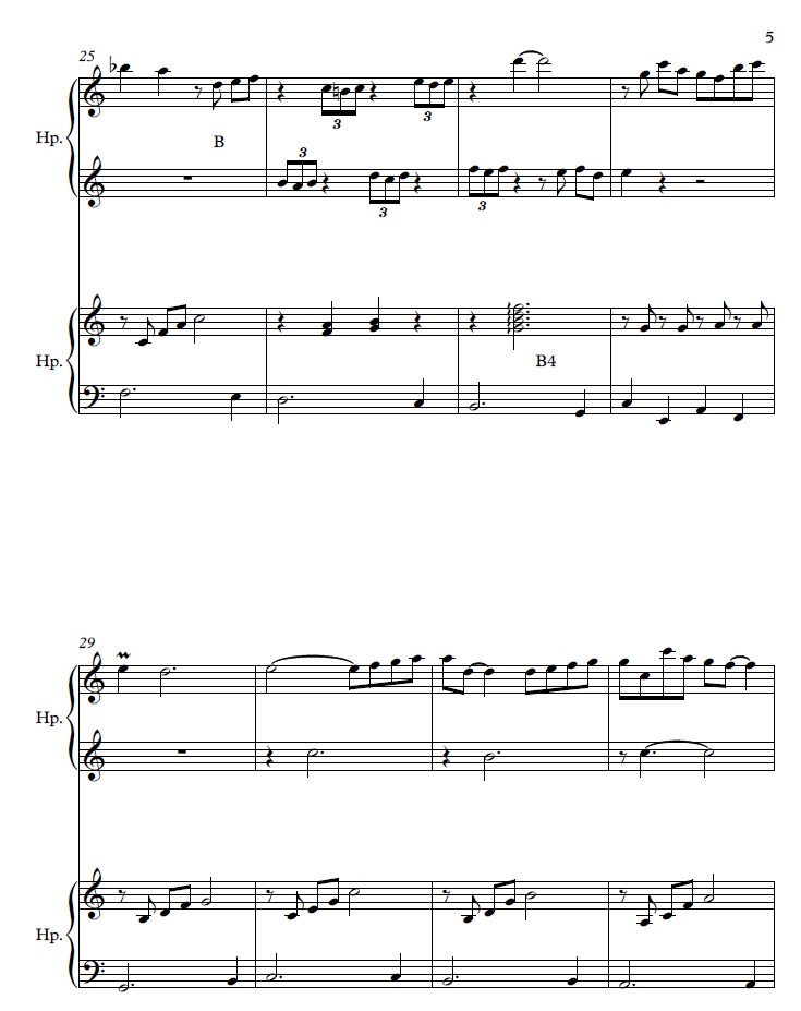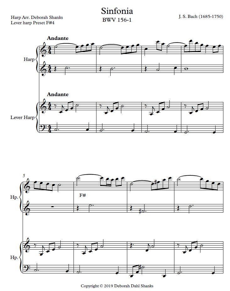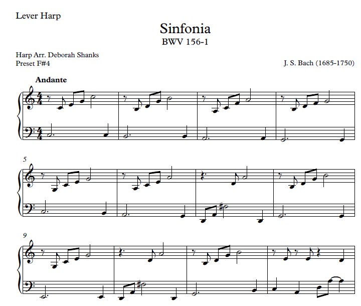 This is an arrangement of the well-beloved “overture” to Johann Sebastian Bach’s cantata Ich steh mit einem Fuß im Grabe, BWV 156. Harp 1 (pedal) carries the melody and is the more difficult of the parts, with several pedal changes and triplet and sixteenth note rhythms. Harp 2 (large lever) carries the arpeggiated accompaniment, has larger stretches in the LH (up to a tenth), and contains a couple rolled chords.