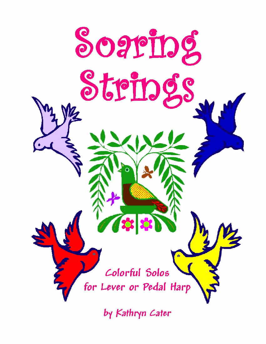 Ms. Cater is a wonderful harp teacher who knows how to write music for learners. Volume four of Kathryn’s excellent music for students is cleverly written. Each tune builds good technique and lays well under the fingers. Although geared for children, these lovely melodies can be enjoyed by any harpist, young or old, beginner or advanced. With a bird theme, titles are Mourning Dove, Black Bird Boogie, Flying South, Swallow’s Flight, Little Red Hen, Swans at Sunset, Crows in the Corn, SeaGull, Chickadee Dances. There are no flats, F, C and G sharps are required. Much of the content can be played on a 26-string harp with very few adjustments. EASY, ALL HARPS.