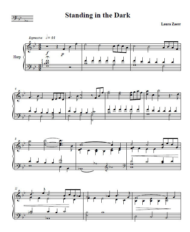 From the composer:  Sometimes when we are surrounded by darkness we become aware of details unnoticed in the broad light of day. Other senses are heightened. Smells become richer, the sense of touch becomes more significant, and very faint sounds can take on huge proportions. Standing in the Dark commemorates those times when we are required to hold our ground in the face of the unknown. In doing so we learn to transform our narrowness into unimagined vistas of brilliance. This original work by Laura Zaerr is soulfully composed in the key of Bb, one modulation to F, then back to Bb. Large-ish LH reaches, sus chords.  Lovely piece.