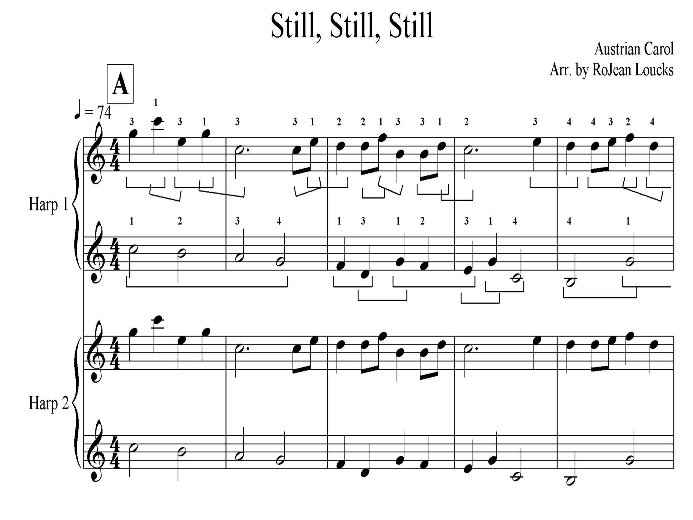 A two-part arrangement of the well-known and loved Austrian carol. Both parts play in unison for the 1st verse, dividing for the remainder of the piece. Harp 1 is beginner level, and fingering and brackets are included. It is playable on a 26-string harp where lowest C is an octave below Middle C. Written for intermediate level, Harp 2 includes large 4-finger chords in 2nd verse, and an arpeggiated variation for the 3rd verse. Key of C. Full score (4 pages) and separate parts are included. ALL HARPS, VARIOUS LEVELS.
