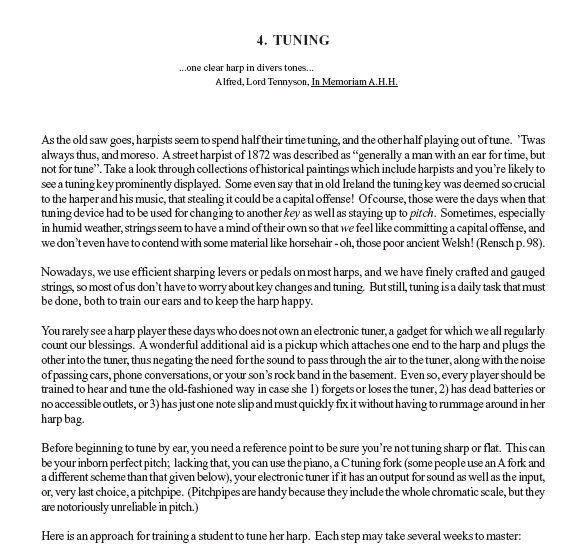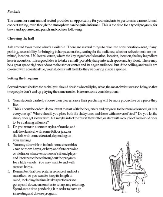 A compilation of ideas, suggestions, and helpful hints from experienced harp teachers. Contributors to this book included Stephanie Curcio, Sue Richards, Kim Robertson, Ellen Tepper, Derek Bell, Liz Cifani, Wendy Kerner Lucas, Louise Trotter, and many more. It was compiled at the Professional Harpers Gathering on the East Coast in the early 1990’s. Sixteen chapters, well over 100 pages on standard sized paper! Includes a complete index. Although dated, this book remains an excellent resource for any teacher of harp.