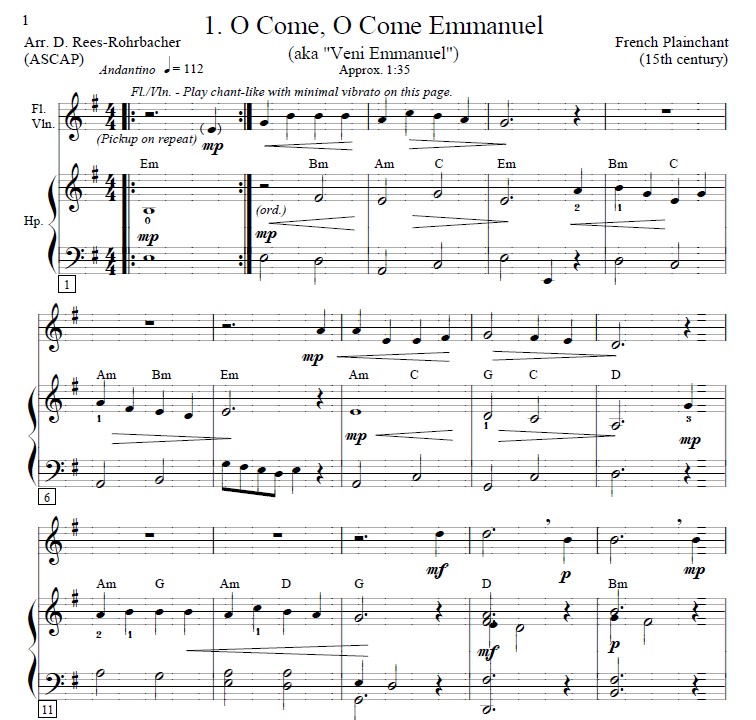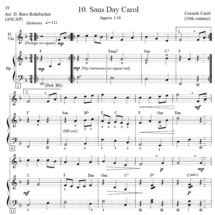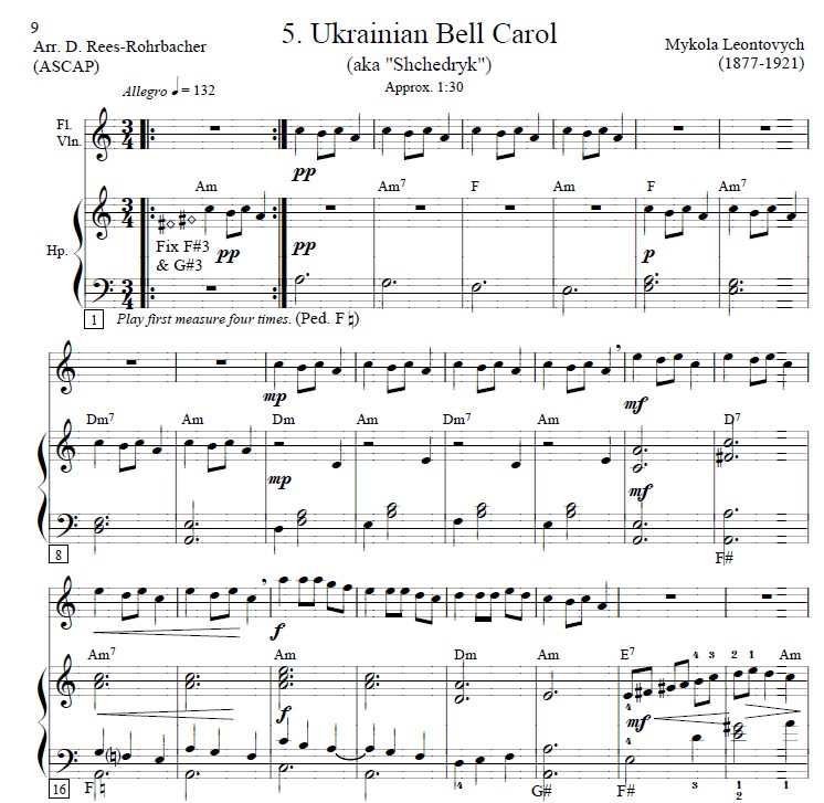 “Three arrangements in this book were adapted from my solo harp collections of Christmas Classics: Personent Hodie, Ukrainian Bell Carol, and The Christ Child’s Lullaby. So, if you own those collections, you will recognize borrowed sections of these arrangements, albeit in a slightly different guise.”