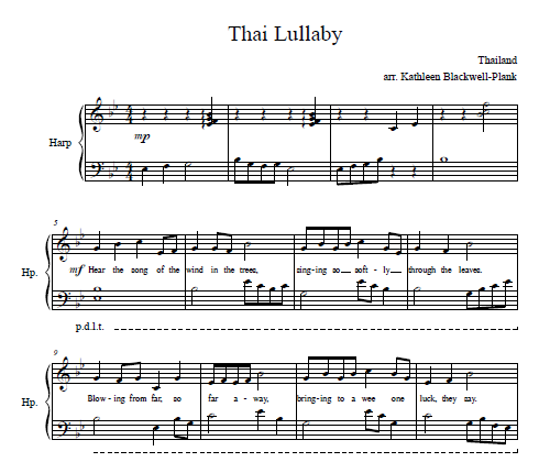 This traditional Thai lullaby utilizes a pentatonic scale: Eb, F, G, Bb, C. The opening line, “Hear the Song of the Wind in the Trees,” uses the imagery of the sound of a gentle breeze moving softly through the leaves to create a soothing, rocking lullaby. The bass line is made of fragments of the pentatonic scale creating a counter melody. Special harp techniques are utilized to imitate the sounds of Asian instruments. It is a good addition to lesson repertoire or a seasoned performer’s background music. ALL HARPS, EARLY INTERMEDIATE.