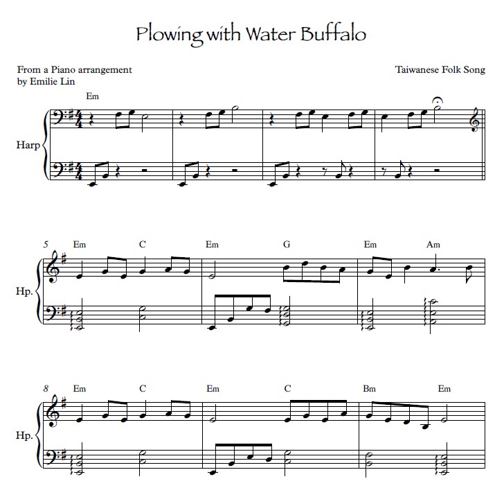“The Asian Harp contains 22 folk songs from Korea, Mongolia, Taiwan, the Philippines and various Chinese Provinces arranged in a style that remains true to the Asian sound while utilizing the character of the harp. The arrangements are appropriate for a large lever harp with 2 octaves below middle C and tuned to Eb or C. Songs in two tunings are noted with an * in Contents. Some songs include a “song version” with words that could be sung and chords for improvising. All arrangements are very accessible for a mid-beginner to intermediate level player with limited or easy lever changes.”