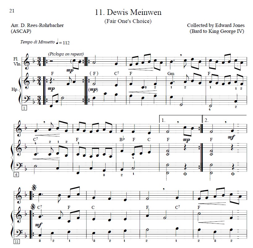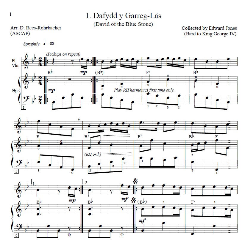 “These airs have been placed in progressive key order to create a satisfying ‘Welsh set’ that facilitates lever (or pedal) changes. This order also facilitates playing 2-4 tunes in succession as a ‘Welsh medley.’ All tunes were typeset to eliminate any page turns within a piece. Where 1st and 2nd endings are indicated on the harp score, they are only listed above the melody instrument line due to space confines; however, the endings apply to all instruments.”