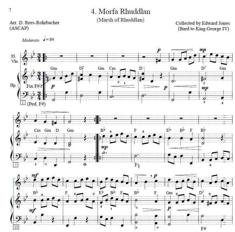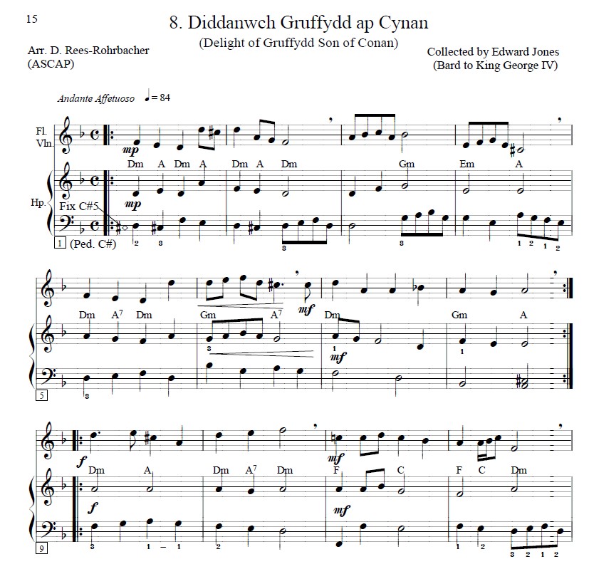 “I have adapted the Welsh tunes for melody instrument with lever harp accompaniment. All of the tunes are presented in Jones’ original keys, except for two (Suo-Gân & Llwyn-Onn), which were transposed to better accommodate the range of both flute and violin when played at pitch as well as up the octave. Guitar chords are included so that the melody may be played by any ‘C’ instrument, accompanied by chords on harp, lute, guitar or keyboard. In addition, the melody could be played as a harp solo, adding the chords to the left hand.