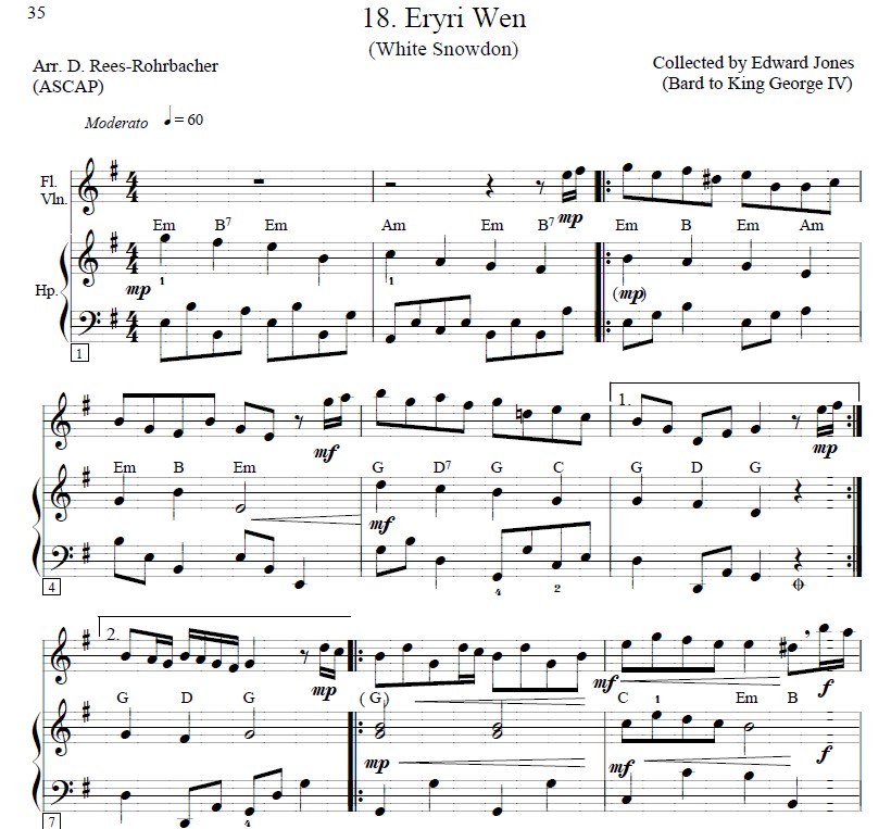 “Some of the bass lines or right-hand figures in the harp score of this collection were borrowed from earlier solo harp publication of mine, notably Old Welsh Airs, The King’s Bard, and The Celtic Solo-Duo Book. So, if they seem ‘familiar’ to those who have played from those books, well – they are! Some parts of the old books were recycled and re-arranged to create this new flute/violin and harp version.