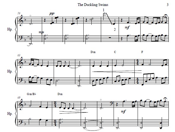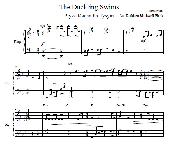 Plyve Kacha Po Tysyni translates “the duckling swims down the Tysyni river.” This traditional old Ukrainian folk song is a warning of the dangers of war. The lyrics are a conversation between a mother and her son which you hear in the arrangement as the melody shifts between the right and left hands. This farewell song in D minor (1-flat) utilizes rolled chords, glissandi, occasional left- and right-hand harmonics, and arpeggios. Chord symbols and historical background are provided. This 7-page PDF includes 3 pages of music. The length of the piece is 4 minutes. ALL HARPS, INTERMEDIATE.